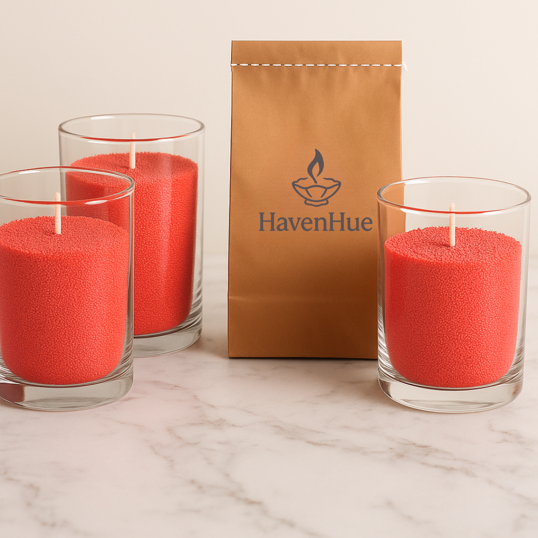 HavenHue is dedicated to sustainability. We use non-toxic, vegan plant-based candle dust and stabilized natural cotton wicks for a clean, guilt-free candle experience.